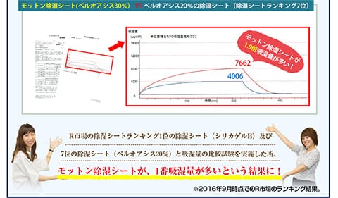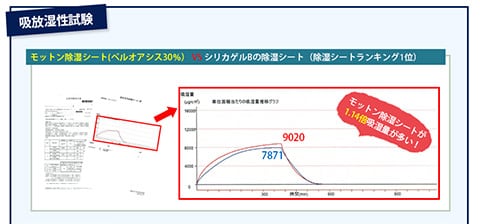 よくあるシリカゲルの除湿シートは繰り返し使用すると性能が低下しますが、モットン除湿シートに使われているベルオアシスは性能が低下しません。