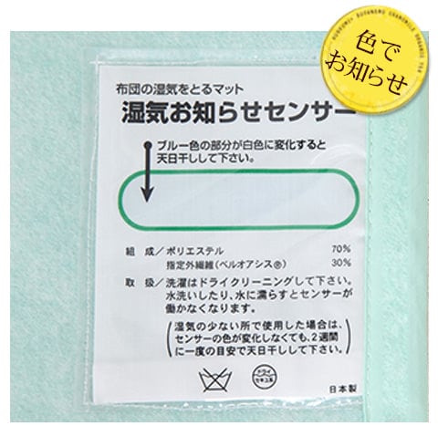 吸湿量が増えると、センサーの色がブルー色から白色に変わります。天日干ししたりふとん乾燥機で乾燥するとセンサーの色がブルー色に戻り、吸湿力が回復します。
