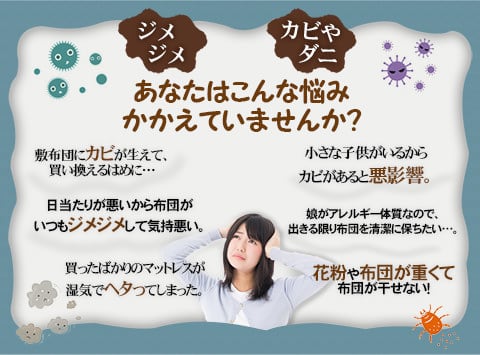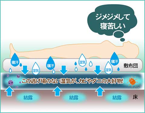 さらに、人は、睡眠時にコップ1~2杯の汗を掻くため、布団は一年中湿気の脅威にさらされています。